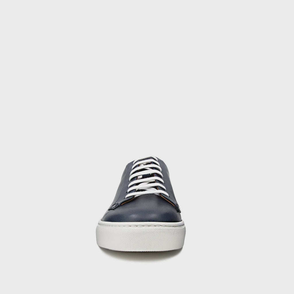 Sneaker stringata realizzata in morbida pelle blue spazzolata. Suola in gomma bianca leggera con lavorazione artigianale AGO. Si abbina perfettamente con abbigliamento sportivo e casual. Made in Italy.