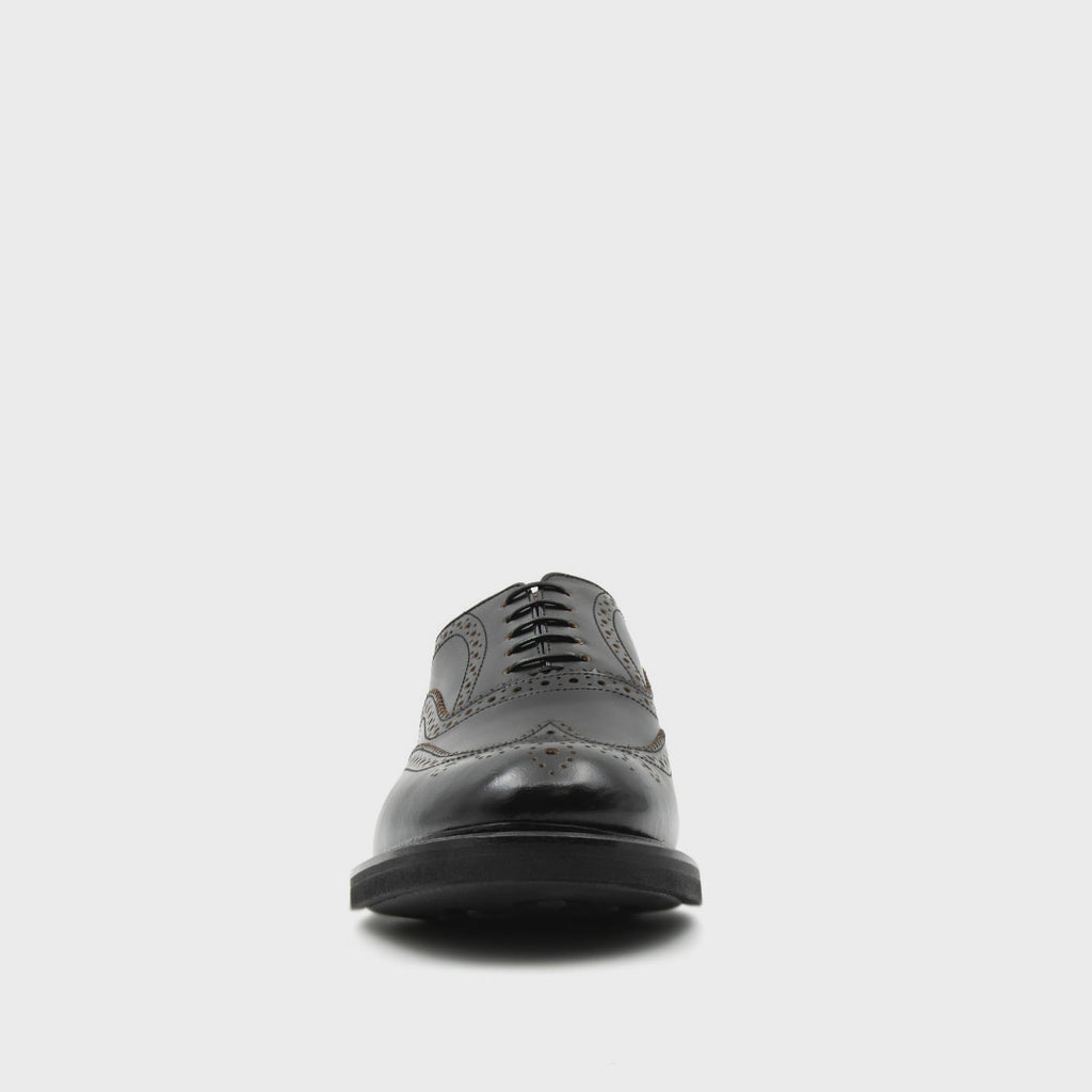 Scarpa stringata da uomo dallo stile inglese perfetta per il lavoro e per il tempo libero. Realizzata in pelle di vitello lucida nera, allacciatura a francesina e suola in gomma antiscivolo per una perfetta aderenza su ogni tipo di terreno. La George è costruita con lavorazione Goodyear Welted artigianale, che, oltre a conferire resistenza e durabilità nel tempo, rende questa scarpa facilmente risuolabile. Calzatura oxford classica con forma confortevole, decorata con rifiniture Brogues a coda di rondine e forature dal disegno a fiore in punta. Si abbina perfettamente con abbigliamento sportivo e casual, in particolare con abiti in tweed. Made in Italy.
