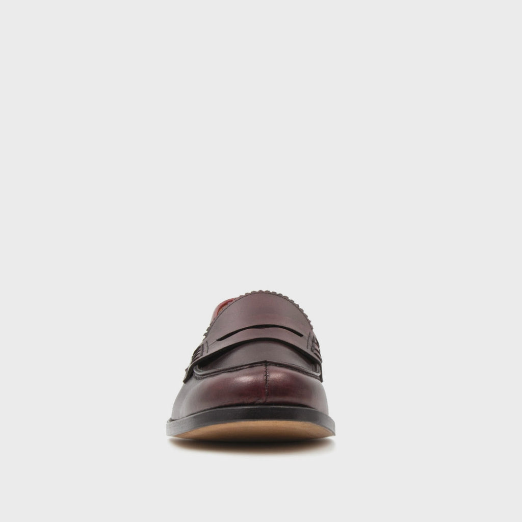 Mocassino da donna artigianale in stile college inglese realizzato in pelle sfoderata e spazzolata a mano di colore burgundy. Costruzione artigianale Blake e suola in cuoio. Linguetta dall'orlo seghettato e doppie cuciture dal look casual. Perfetto per uno stile quotidiano senza tralasciare l'eleganza. Made in Italy.